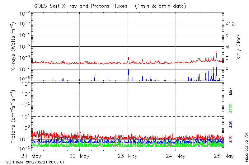 This page provides light-curves generated from GOES soft X-ray and Particle data for the date indicated at the top and the preceding three days.