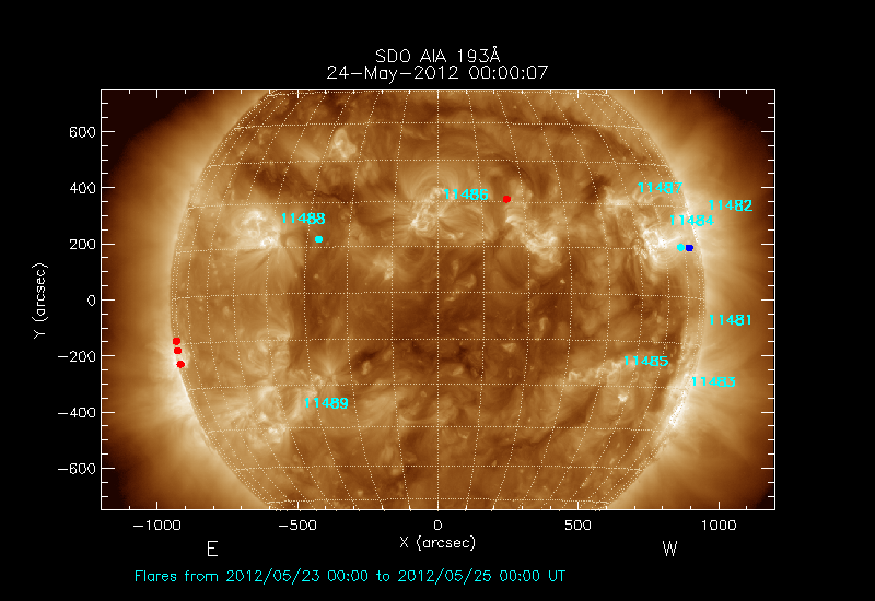 The most recent flares (≤12 hours) are shown as red dots, 12-24 hours ago as blue dots and older ones as turquoise dots.