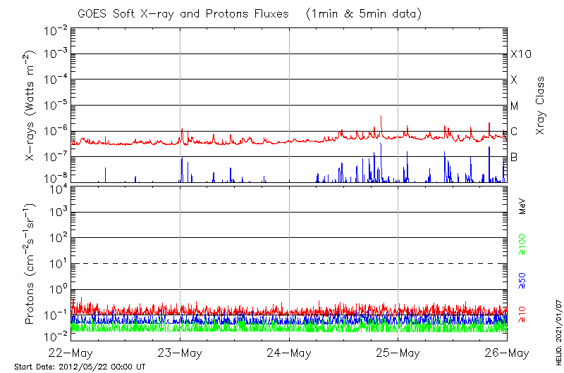 This page provides light-curves generated from GOES soft X-ray and Particle data for the date indicated at the top and the preceding three days.