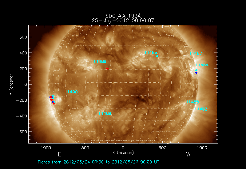 The most recent flares (≤12 hours) are shown as red dots, 12-24 hours ago as blue dots and older ones as turquoise dots.