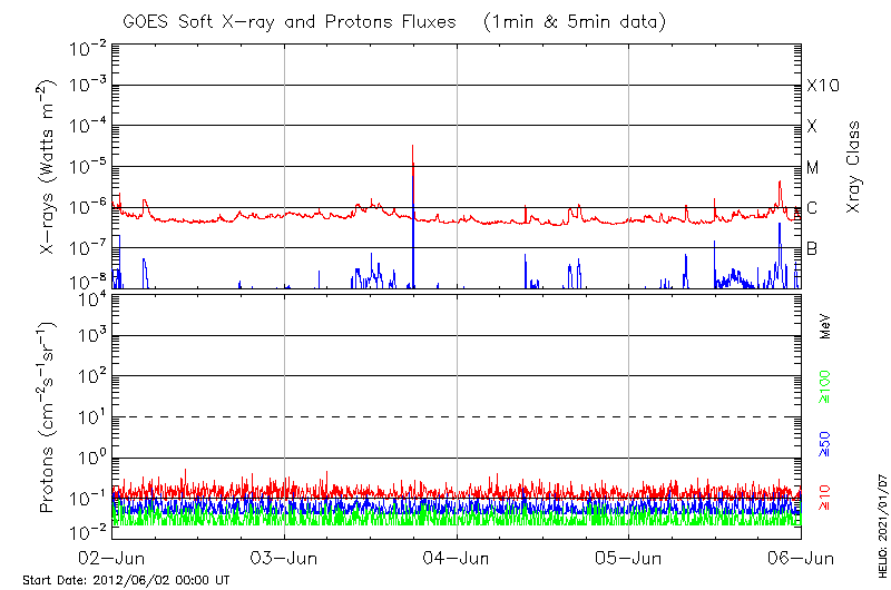 This page provides light-curves generated from GOES soft X-ray and Particle data for the date indicated at the top and the preceding three days.
