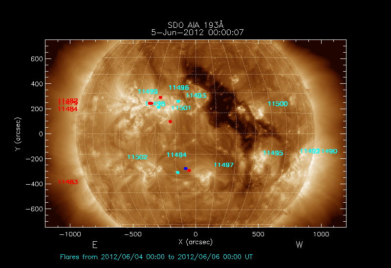 The most recent flares (≤12 hours) are shown as red dots, 12-24 hours ago as blue dots and older ones as turquoise dots.