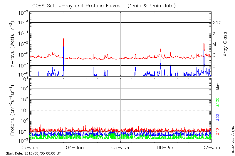 This page provides light-curves generated from GOES soft X-ray and Particle data for the date indicated at the top and the preceding three days.