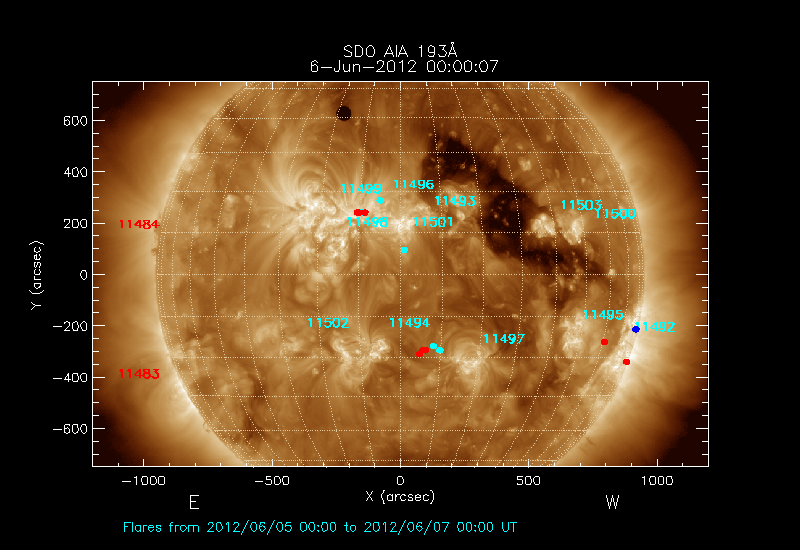 All soft X-ray flares (≥A1.0) where the location has been determined are shown; the flare locations are rotated to the time of the image