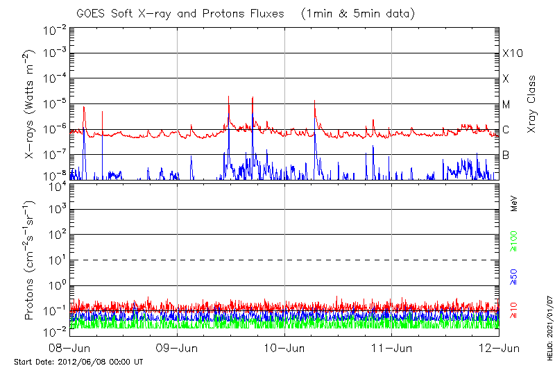 This page provides light-curves generated from GOES soft X-ray and Particle data for the date indicated at the top and the preceding three days.