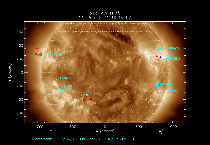 The most recent flares (≤12 hours) are shown as red dots, 12-24 hours ago as blue dots and older ones as turquoise dots.