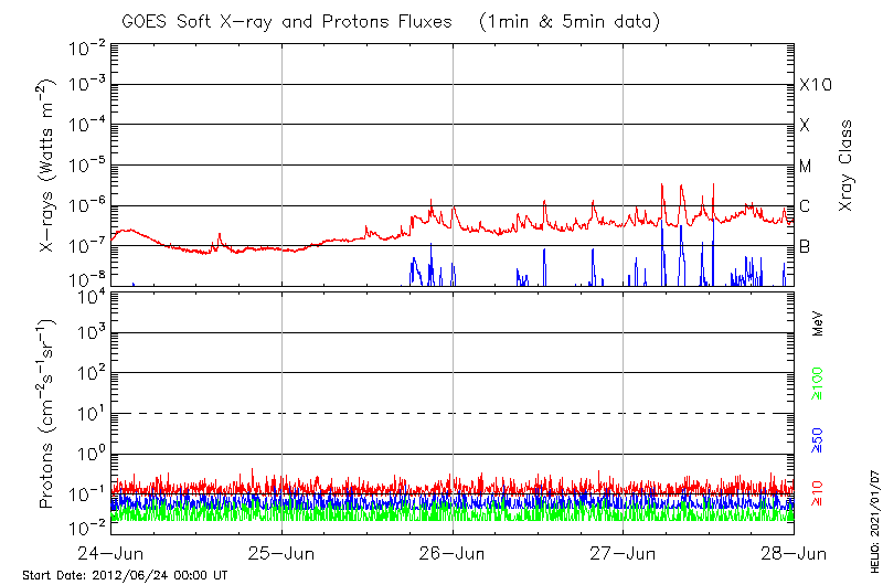 This page provides light-curves generated from GOES soft X-ray and Particle data for the date indicated at the top and the preceding three days.