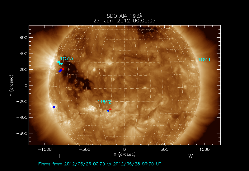 The most recent flares (≤12 hours) are shown as red dots, 12-24 hours ago as blue dots and older ones as turquoise dots.