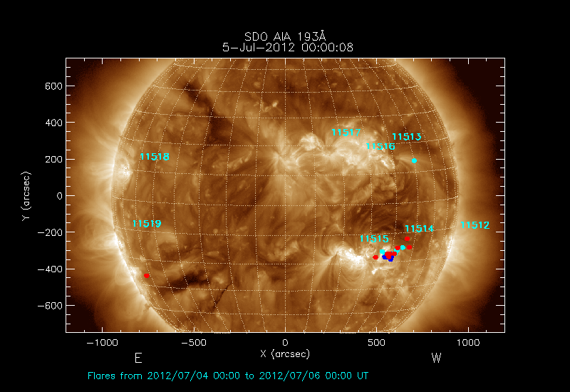 The locations of the flares over-plotted on the image are derived from the flare catalogue