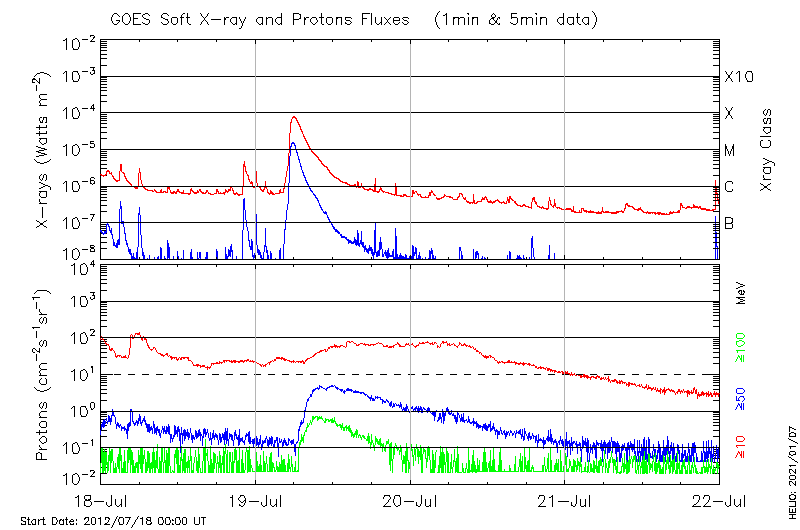 This page provides light-curves generated from GOES soft X-ray and Particle data for the date indicated at the top and the preceding three days.