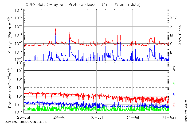 This page provides light-curves generated from GOES soft X-ray and Particle data for the date indicated at the top and the preceding three days.