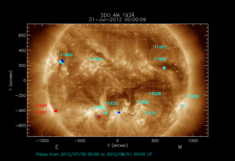 The locations of the flares over-plotted on the image are derived from the flare catalogue