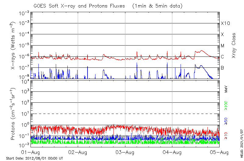 This page provides light-curves generated from GOES soft X-ray and Particle data for the date indicated at the top and the preceding three days.