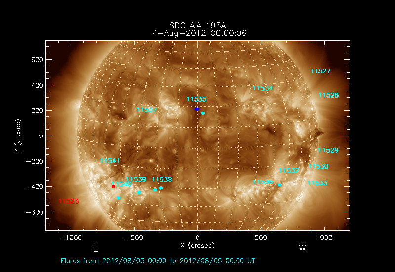 The locations of the flares over-plotted on the image are derived from the flare catalogue