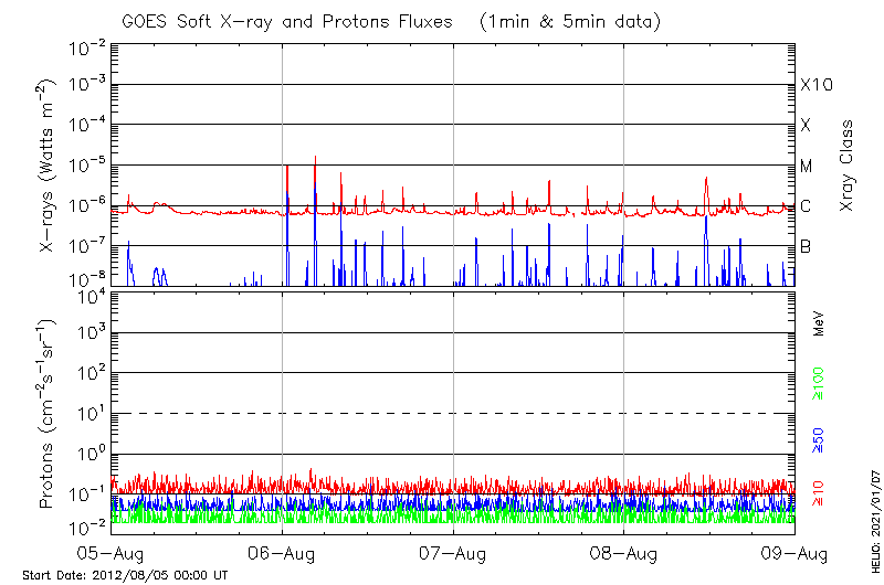 This page provides light-curves generated from GOES soft X-ray and Particle data for the date indicated at the top and the preceding three days.