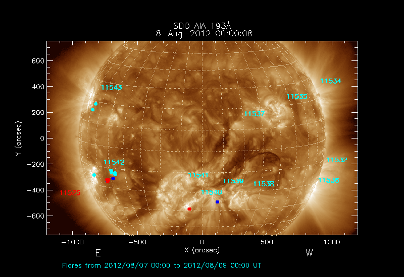 The most recent flares (≤12 hours) are shown as red dots, 12-24 hours ago as blue dots and older ones as turquoise dots.