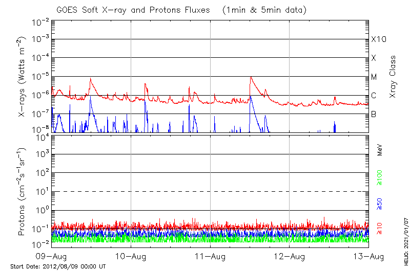 This page provides light-curves generated from GOES soft X-ray and Particle data for the date indicated at the top and the preceding three days.