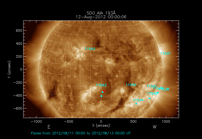 The most recent flares (≤12 hours) are shown as red dots, 12-24 hours ago as blue dots and older ones as turquoise dots.
