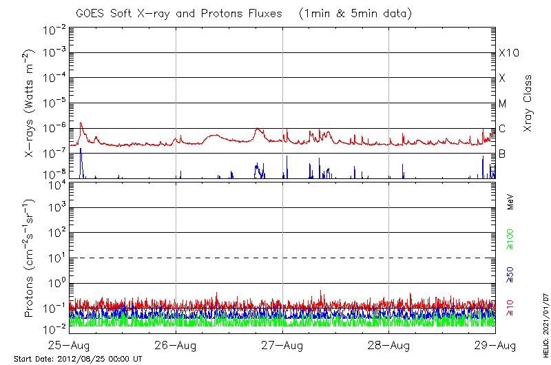 This page provides light-curves generated from GOES soft X-ray and Particle data for the date indicated at the top and the preceding three days.