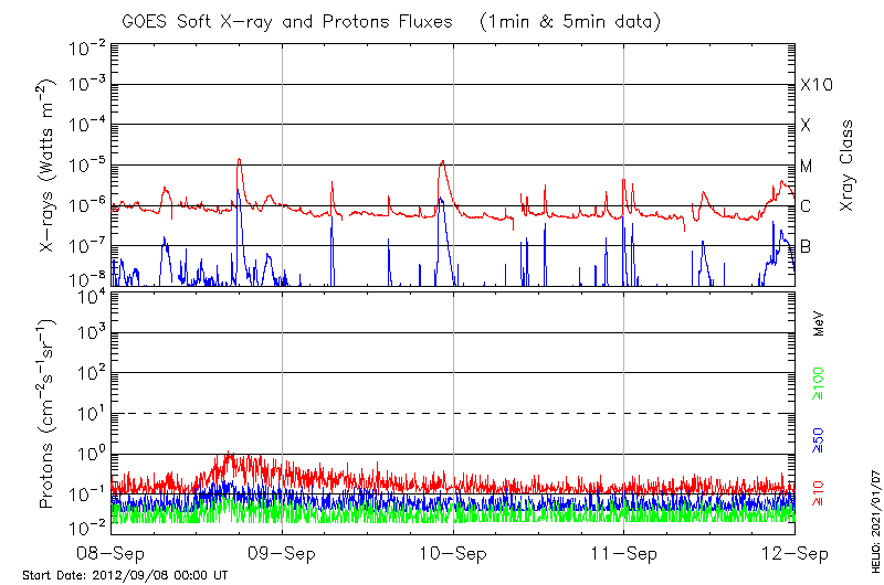 This page provides light-curves generated from GOES soft X-ray and Particle data for the date indicated at the top and the preceding three days.