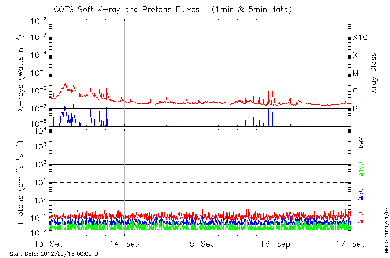 This page provides light-curves generated from GOES soft X-ray and Particle data for the date indicated at the top and the preceding three days.