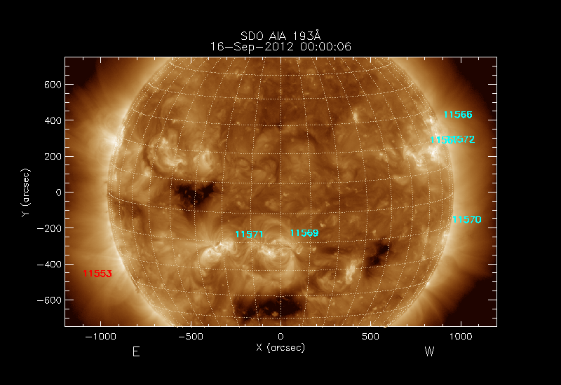 Click on an Active Region plot to display the Region Report including the region evolution and flaring history. HEC Search for NOAA Active Regions (SRS) records for this date and the day before.