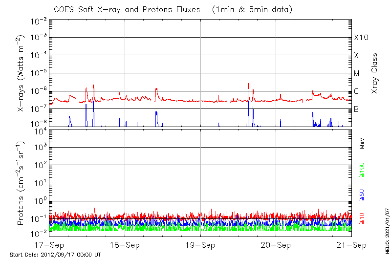 This page provides light-curves generated from GOES soft X-ray and Particle data for the date indicated at the top and the preceding three days.