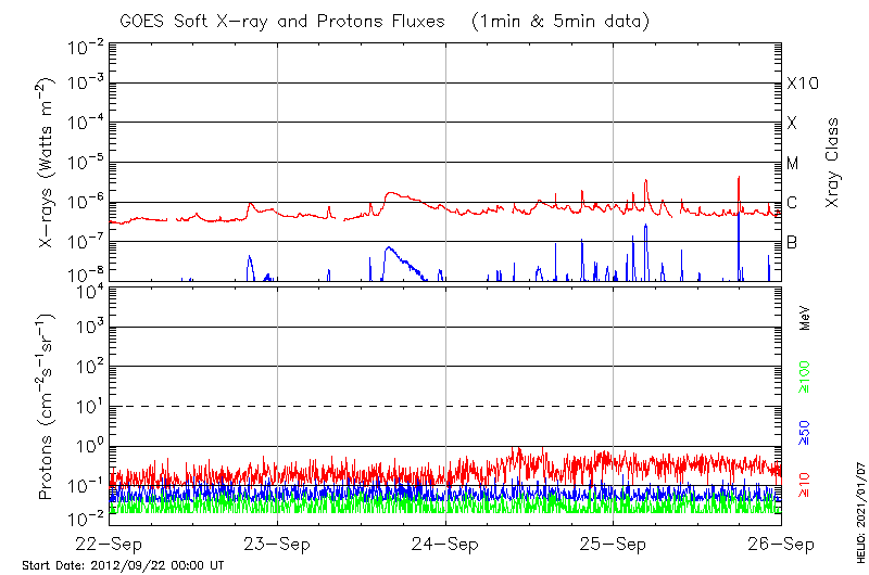 This page provides light-curves generated from GOES soft X-ray and Particle data for the date indicated at the top and the preceding three days.