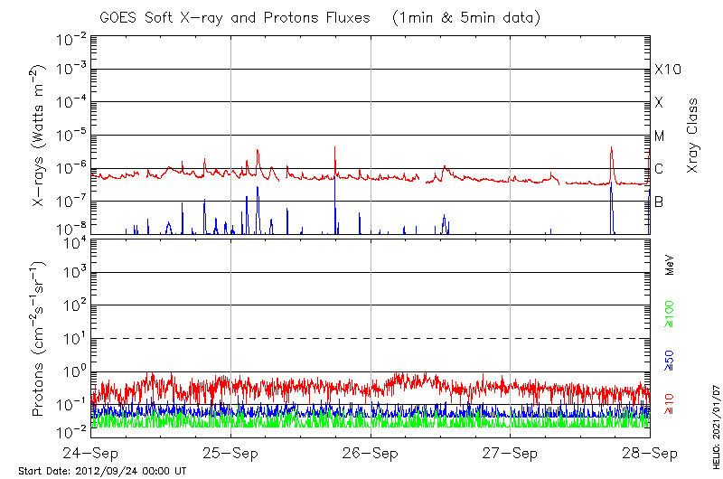 This page provides light-curves generated from GOES soft X-ray and Particle data for the date indicated at the top and the preceding three days.