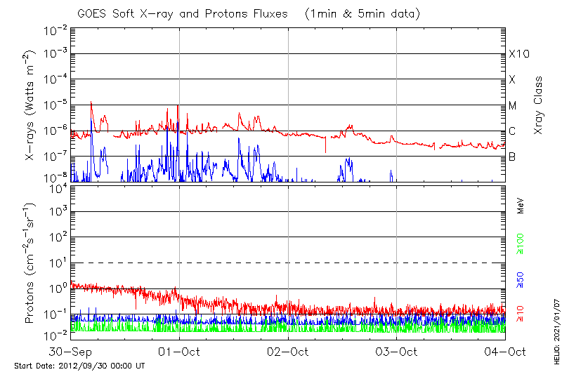 This page provides light-curves generated from GOES soft X-ray and Particle data for the date indicated at the top and the preceding three days.