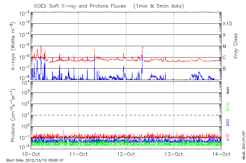 This page provides light-curves generated from GOES soft X-ray and Particle data for the date indicated at the top and the preceding three days.