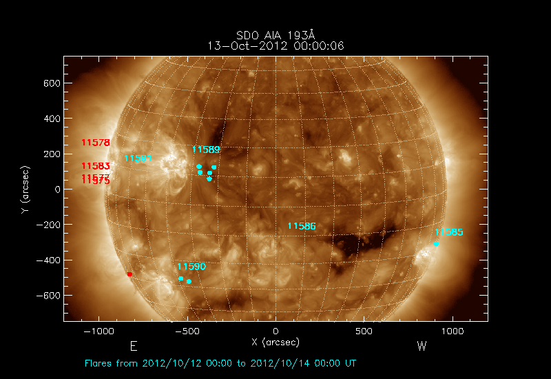 The most recent flares (≤12 hours) are shown as red dots, 12-24 hours ago as blue dots and older ones as turquoise dots.