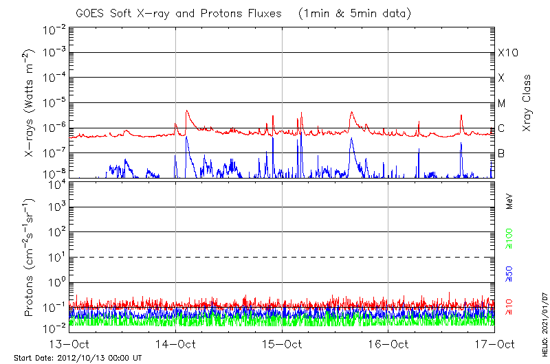 This page provides light-curves generated from GOES soft X-ray and Particle data for the date indicated at the top and the preceding three days.