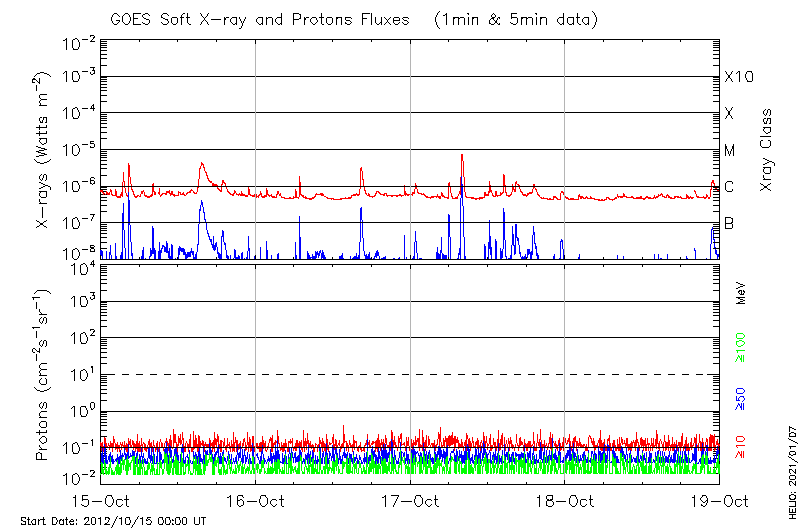 This page provides light-curves generated from GOES soft X-ray and Particle data for the date indicated at the top and the preceding three days.