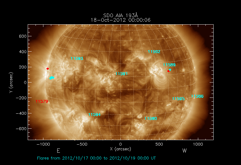 The most recent flares (≤12 hours) are shown as red dots, 12-24 hours ago as blue dots and older ones as turquoise dots.