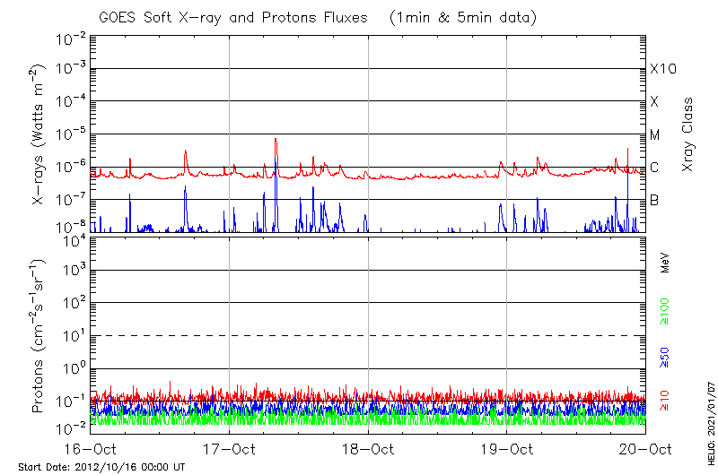 This page provides light-curves generated from GOES soft X-ray and Particle data for the date indicated at the top and the preceding three days.