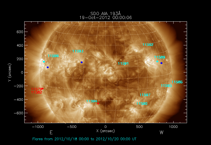 The most recent flares (≤12 hours) are shown as red dots, 12-24 hours ago as blue dots and older ones as turquoise dots.