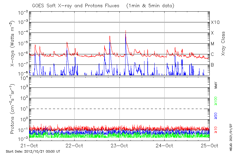 This page provides light-curves generated from GOES soft X-ray and Particle data for the date indicated at the top and the preceding three days.