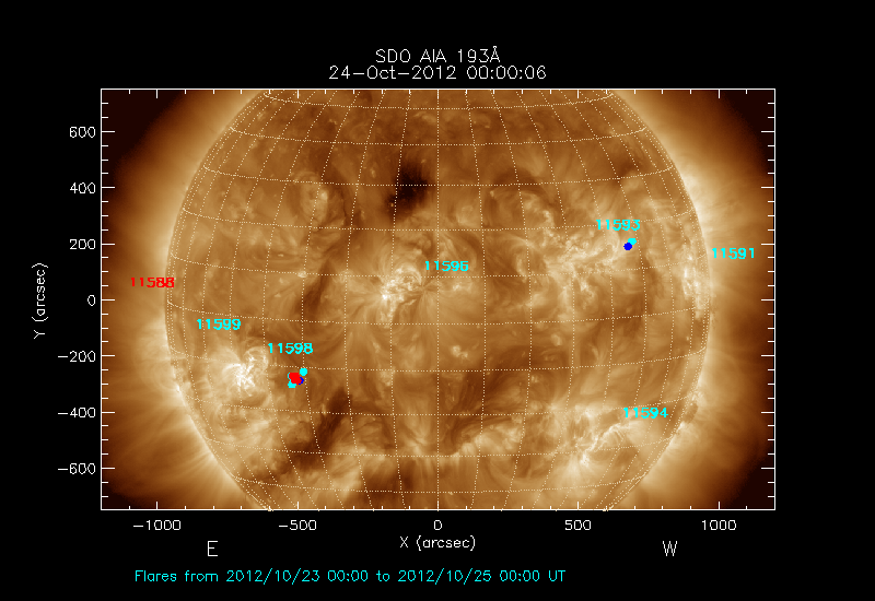 The most recent flares (≤12 hours) are shown as red dots, 12-24 hours ago as blue dots and older ones as turquoise dots.