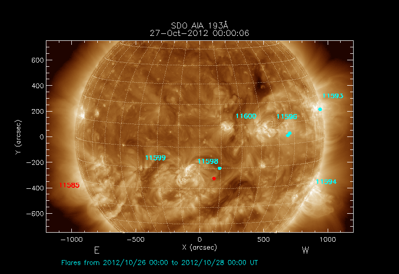 The most recent flares (≤12 hours) are shown as red dots, 12-24 hours ago as blue dots and older ones as turquoise dots.