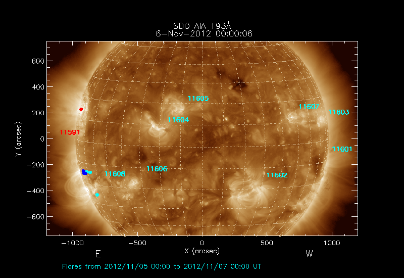 The most recent flares (≤12 hours) are shown as red dots, 12-24 hours ago as blue dots and older ones as turquoise dots.
