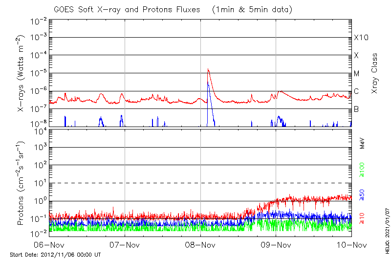 This page provides light-curves generated from GOES soft X-ray and Particle data for the date indicated at the top and the preceding three days.
