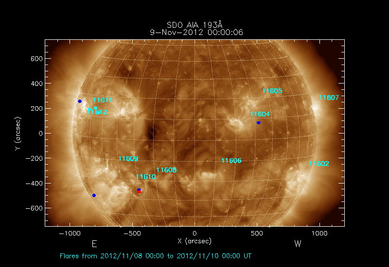 All soft X-ray flares (≥A1.0) where the location has been determined are shown; the flare locations are rotated to the time of the image