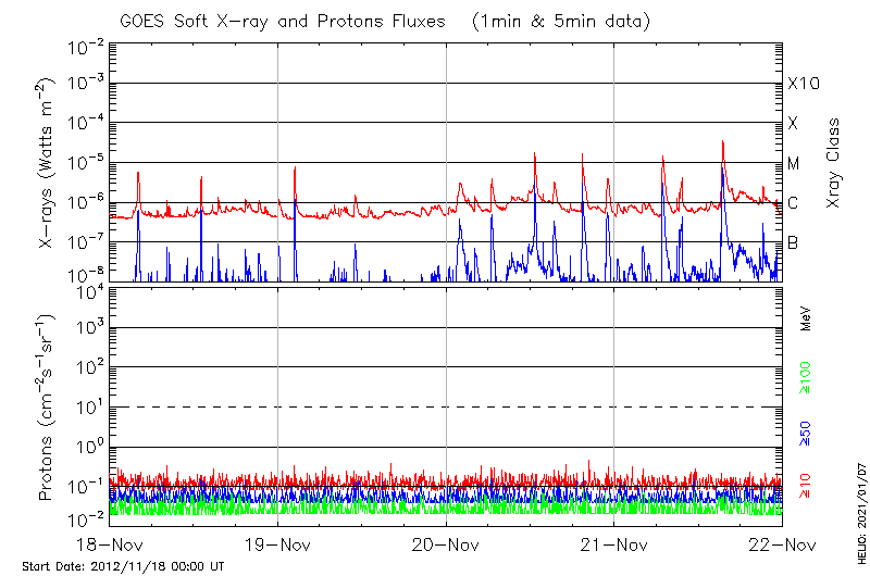 This page provides light-curves generated from GOES soft X-ray and Particle data for the date indicated at the top and the preceding three days.