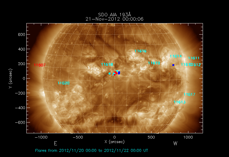 The most recent flares (≤12 hours) are shown as red dots, 12-24 hours ago as blue dots and older ones as turquoise dots.