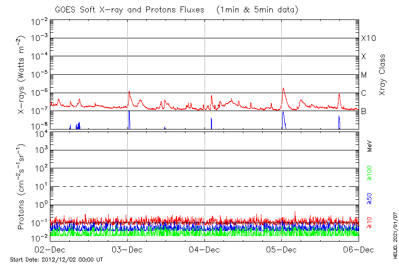 This page provides light-curves generated from GOES soft X-ray and Particle data for the date indicated at the top and the preceding three days.