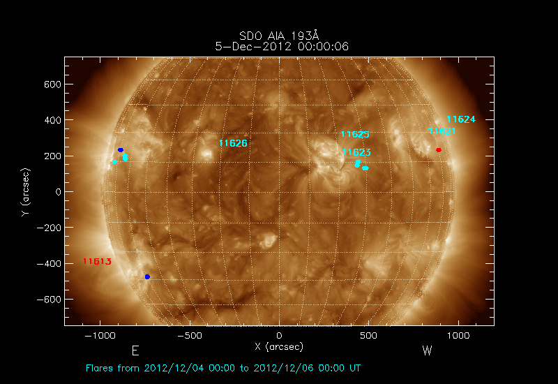 The most recent flares (≤12 hours) are shown as red dots, 12-24 hours ago as blue dots and older ones as turquoise dots.