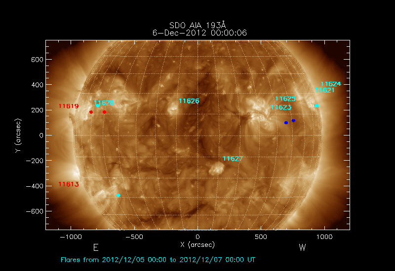 The most recent flares (≤12 hours) are shown as red dots, 12-24 hours ago as blue dots and older ones as turquoise dots.