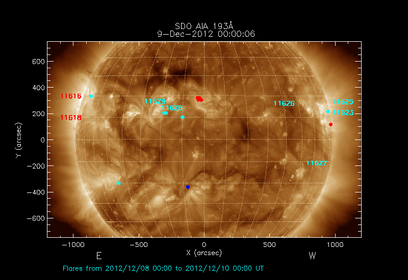 The locations of the flares over-plotted on the image are derived from the flare catalogue