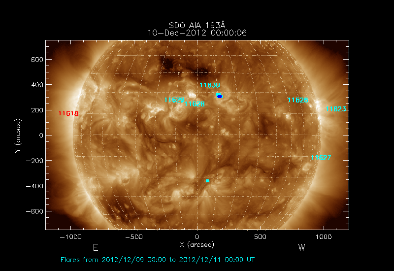 The locations of the flares over-plotted on the image are derived from the flare catalogue